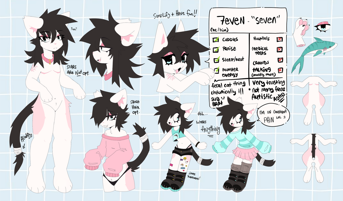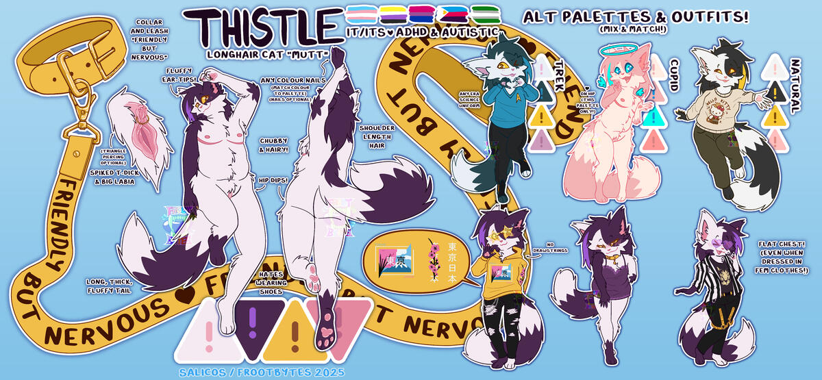 lAPPEARANCEl Thistle is chubby. It stands at around 5'8" and around 200lbs. Thistle's fluffy black and white fur is often a mess, partially due to how fluffy it is, but mostly due to lack of regular maintenance. It has a pink nose and paw-pads, top surgery scars, and yellow eyes. Thistle is nonbinary, and since they’re on testosterone things look a little different than a cisgender vagina would. Their clitoris is enlarged; it measures around 1.5-2 inches long when erect. Underneath the foreskin, it has small barbs. Their long hair design is currently what I prefer to use, and I will likely draw it with long hair unless otherwise specified.